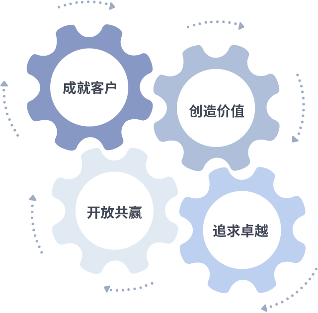 成就客户是一切决策的出发点,,创造价值是衡量所有工作的标准,,追求卓越是我们做事做人的态度,,,开放共赢是我们的格局也是最终的结果。。价值观的齿轮环环相扣,,,推动着组织里的每个人不断向前。。。